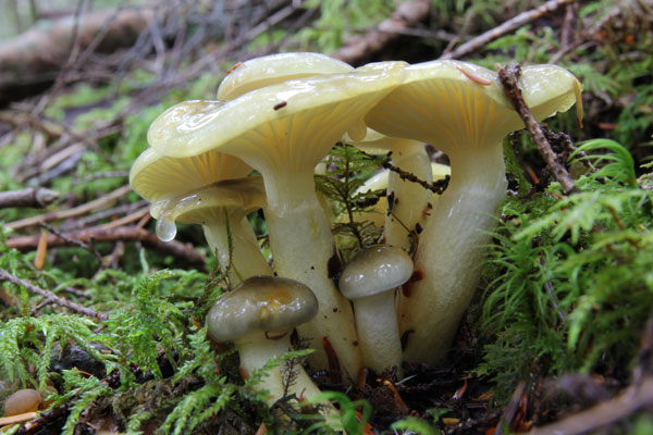 | 針葉樹林のコケ上に発生する、傘の径5センチ前後 | 柄には、薄っすらと白いつば残りがあり、それより下部には、ぬめりがある。 |
