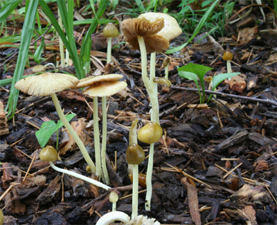 入梅の頃ウッドチップの蒔かれた場所などに発生する小型のキノコ