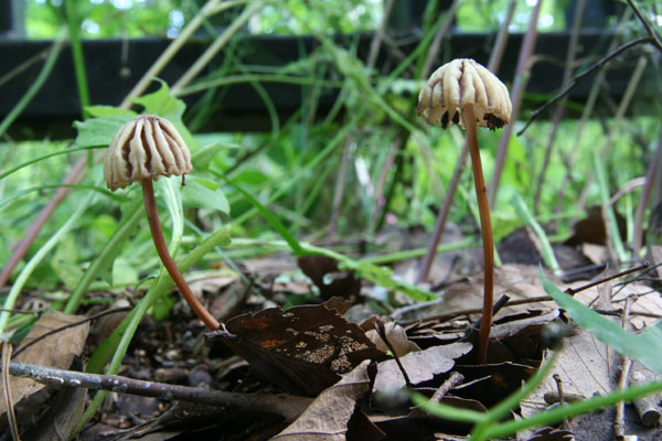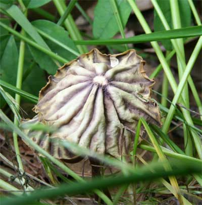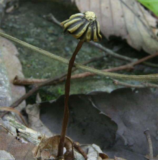 | 成熟過程でだいぶ乾燥してしまっているようだがスジがはっきりと分かる。 傘の径は1センチに満たない。 | |