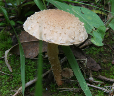 | 傘の表面はクリーム色〜麦わら色 淡褐色の鱗片を散布 | ひだは直生 やや密 傷つけるとやや濃くなる |