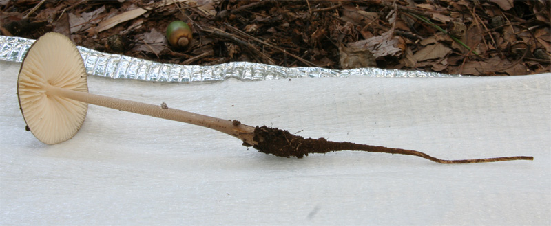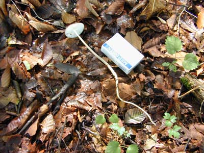 | キノコを真上に慎重に引き抜くと土の中に深く入り込んだ長い柄が、出てくるので面白い。こんどは、もっと長いのを探して、ギネスブックに載せよう。 | |