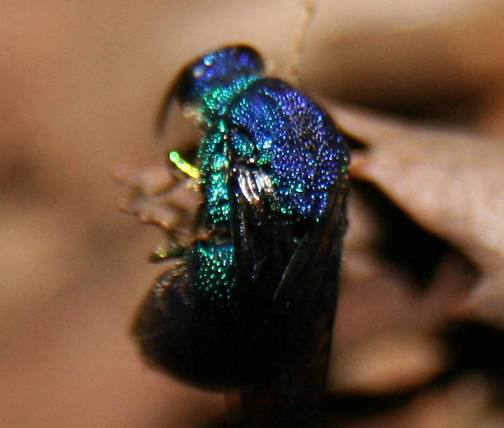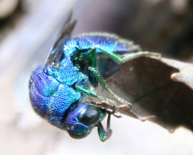 | 地面にはいつくばりキノコの写真を撮っていると、ブルーに輝く物体が目飛び込みました。 | |