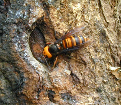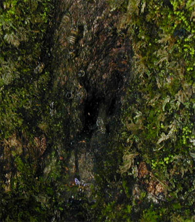 | ブナに作ったニホンミツバチの巣 山梨県 撮影直前にはスズメバチが数匹攻撃していた、また近くには新しいクマの糞(?)と思われるものがあった(こわー)。 |