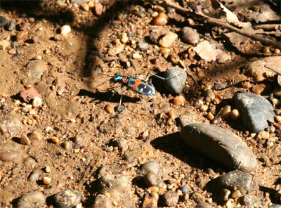 子供の頃、団地内の広場で、この綺麗な昆虫を捕まえようとして、広場を走り回ったのを覚えている。 林道の日当たりの良い場所の地面の上を歩いていた。近くに寄ると飛んでしまい、数メートル先の地面や草などに停まり、これを繰り返す。写真を撮られるのは嫌いらしい。