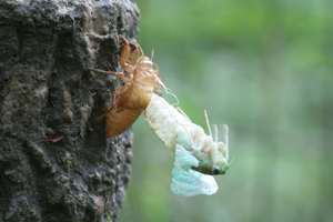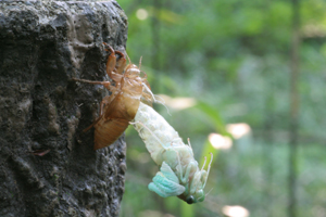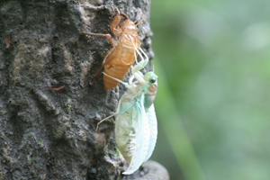 | アブラゼミの羽化は何度もみていますが、ヒグラシの羽化を見たのは初めてです。 透明になる前の青っぽい翅の色がきれいでした。去年はヒグラシのメスに寄生するセミヤドリガを沢山見ました。 地中の7年を経て、やっと華やかな世界に飛び立つ準備完了だが、 この後にも子孫繁栄のための大一番が待ち受けているのでしょう。 | ||