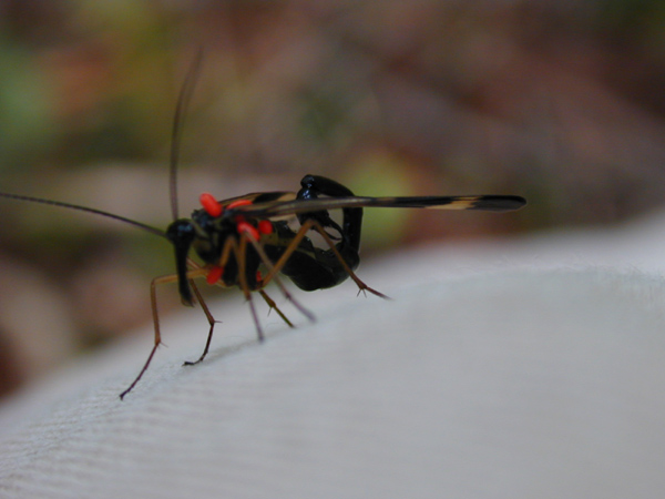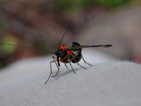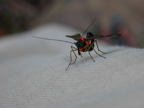 キノコを探していたら赤い色の目立つ昆虫が飛んでいた、何だろう思い追いかけていたらズボンの上で止まったので撮影した。赤い塊は何なんだろう?卵? 寄生虫?