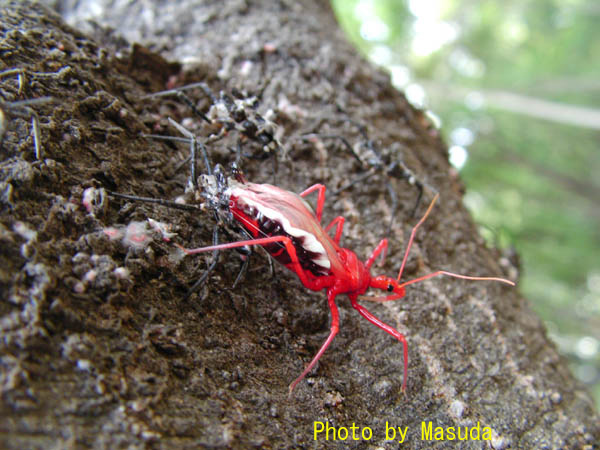 | 脱皮直後は赤い色、後に黒くなる。 サシガメの名のとおり他の昆虫やその幼虫を刺して体液を頂くための口吻が見えます。 |