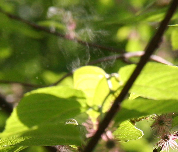 | 風が少し止むと時々、たばこの煙を吐いた様な花粉を観察できます。(運が良ければ) ひたすら待つしかない。 | |