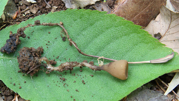 | クワ菌核病に侵され実は赤から黒へと熟すことなく、白くなり落下するそうです。落下し冬を越した果実からキツネノヤリタケやキツネノワンというキノコが発生する。 クワの木は雄株と雌株があり、これらキノコは雌株の樹下で発生する。 | |