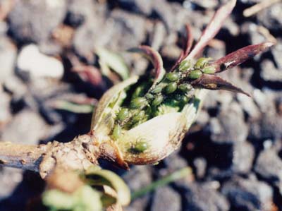 | 実 6月18日 | 芽には春を待ちかねたアブラムシが集まっている。この植物には、昆虫を誘導する花外蜜腺といわれる構造を備えているらしい。 |