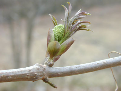 | 芽は対に発生するが、一対ずつ時間差を置いて発芽しいてるように思われる。発芽時期の早い植物なので、霜で一対の芽がだめになっても後発の芽が、カバーする仕組みなのか? | |