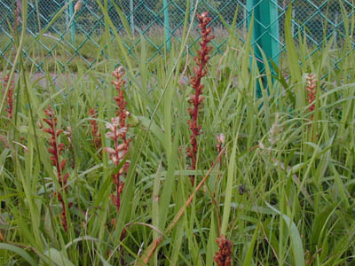 | 寄生か腐生植物の仲間であることは、すぐに分ったが、じぶんの持っている図鑑には載っていなかった。帰化植物だそうだ。 マメ科やせり科キク科の植物に寄生する。辺りにはヨモギがあったので、これが宿主であることが推測できるが確認はしていない。 植物は通常、土壌から水と無機物を吸収し、光と二酸化炭素でデンプンを合成して、生きていくが、この植物は他の植物が光合成し作り出した有機物を頂くので、自分では葉緑体を持たない。(だったら、こんなに日当たりの良い所でじゃなくても・・・・) 他にも、寄生植物ではオニク、腐生植物では、オニノヤガラやギンリョウソウなどがある。 |