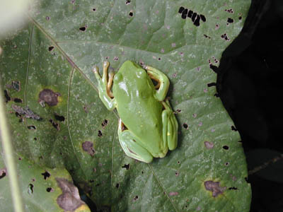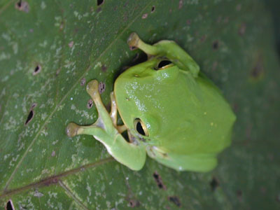 | アマガエルだと思っていたが、鼻先の形や背中の黄色い点、目の両脇の黒い線の不在などから、シュレーゲルアオガエルと思われる。馴染めない名前だ。 | |