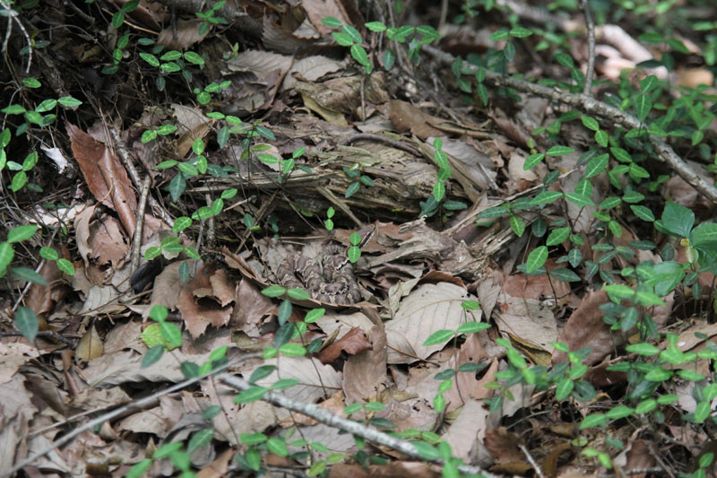 | 尾根道の脇を見ながらキノコを探し歩いていたら、不自然な模様が目に入った。アオダイショウの幼蛇にも似たよう模様があるが、尾の短かさや、動きの鈍さ(毒蛇の貫禄)がそれとは違っていた。 地面にしゃがみ込んで夢中で小さなキノコの写真を撮っている時には、この動きの無い小型のヘビには気づかないだろう。 怖わ! |