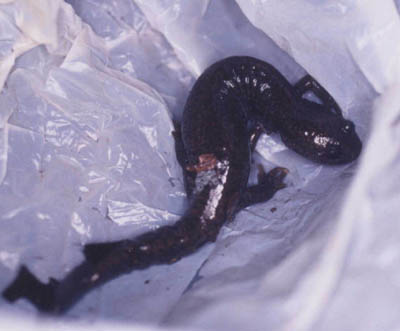急斜面を歩いていて、落ち葉の層がめくれ、中から冬眠中、または準備中のサンショウウオが出てきてしまった、ごめんなさい。撮影後逃がしました。