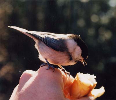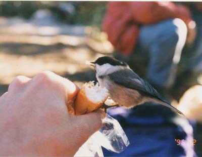 友人と腰を降ろし昼食を食べていると、近くにシジュカラが2、3びき寄って来た。 もしかして餌をおねだりしてるのかなと思い、パンを差し出してみると、手の上で食べ始めた。 食事をここで取るハイカーが多いことを彼らは学習したのだ。こんな深い山の中で、野鳥が人間から直接餌を取ることには、驚いた。