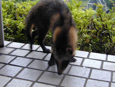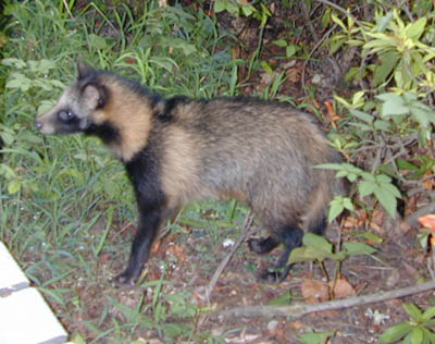 2001年8月 西武遊園地内でごみ箱を漁っていた。 この近辺では、夜間にタヌキを見ることはあるが、この距離で見たのは、初めて。