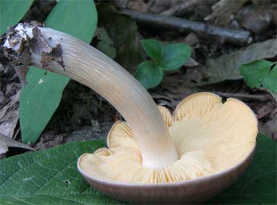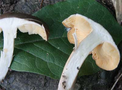 小豆色の傘にクリーム色のひだの中型のイッポンシメジ科?
