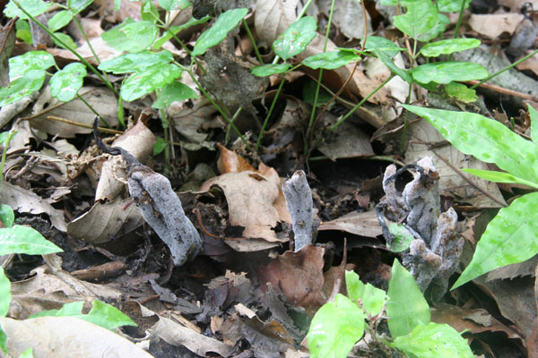 10センチほどの背丈、表面はビロード状というかカビに侵されているようにも見える。 毎年歩道脇に発生する。 先端は黒く細い