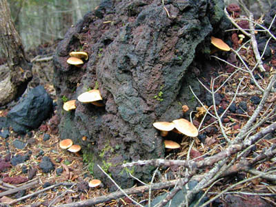 | 火山岩の隙間から発生する事ができる。 わずかなカラマツの枯葉や苔などを利用して菌糸が成長するのだろう。キノボリイグチやベニハナイグチ類も同じような環境を好むが、ここまでの裸の火山岩からは発生できないようだ。 | |
