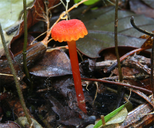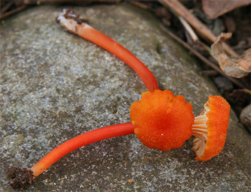 小型だがよく目立つ、 ひだは垂生し黄色でやや疎 柄は傘と同色