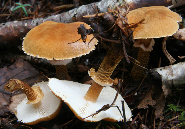 柄はつばより下は橙褐色の細粒や微毛に覆われる ひだは白色
