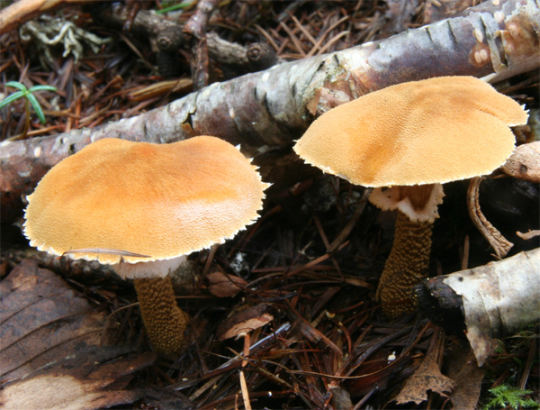 傘は小型で橙褐色細粒に覆われ、縁部つばの破片が鋸歯状に付着