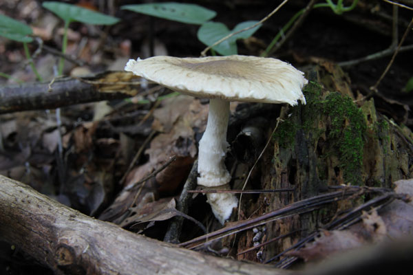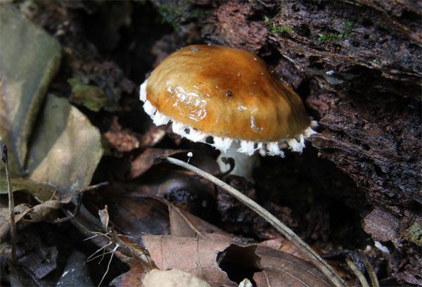 | つばは不鮮明だが名残りの白い綿状の繊維がフリル状に付着していた、径3〜4センチ 落ち枝沿いにその下から発生しているようだ。 |