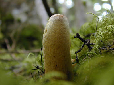 ![]() 幼菌 7月30日 3号目付近 ソーセージの様に細長いキノコを見つけ家で図鑑で調べたが同定できず、翌週山で同じキノコが成長したのを見てウスタケと同定できた。 |