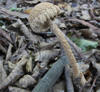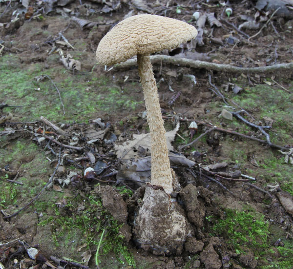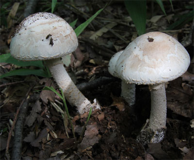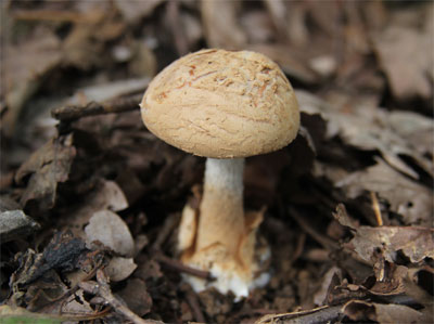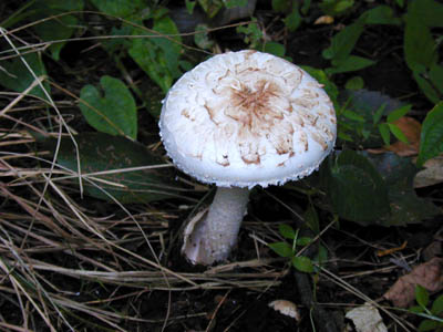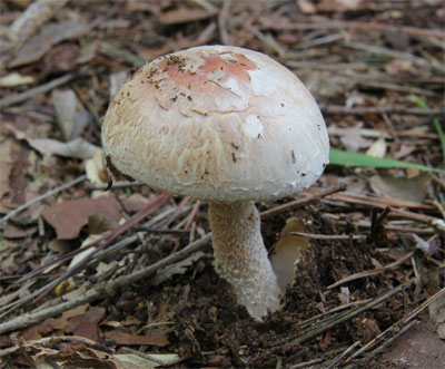 | どこでも見られる猛毒キノコ。 つぼの破片が傘に多く付着して少しピンクかかった模様がある。 | |