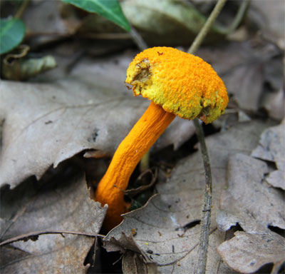 | 傘や柄がやや粉状で鮮やかやオレンジ色のきのこ この丘陵を15、6年歩いていて初め出会えて嬉しかったのだが、個体の状態と発生していた場所が良くなかった?? | |