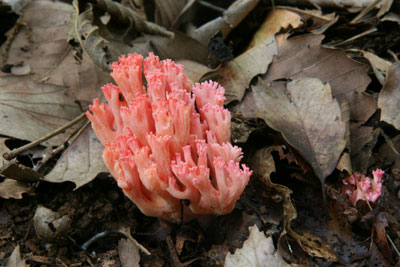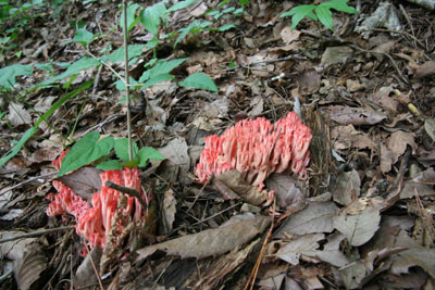 広葉樹林の山の斜面に輪郭を作り群生していた。食用のホウキタケに有るような大きな基部は無い。 毒キノコ
