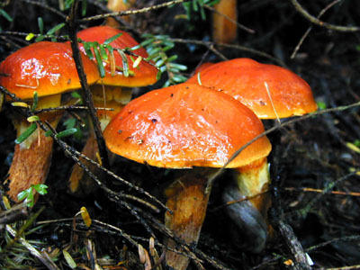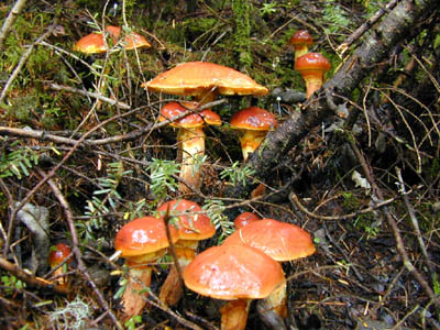 | カラマツ林の樹下に発生するナメコのようにぬるぬるしたキノコ。 マツタケ目的で富士山を歩き始めた頃、出会った人に、「ハナイグチのたくさん採れるような所にはマツタケは出ない」と言われた。あの頃は、マツと付く名前の木には、マツタケが生えると思っていた。長野辺りでは、人気のあるキノコらしいが、味噌汁等でこのキノコだけを入れると、なんだかカビ臭い個体がある時がある。他の種類のキノコと混ぜて料理した方が、ベーターだと思う。刻んで牛乳とコンソメだけのスープでも美味い。 | |