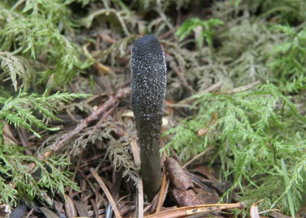 菌核の表面から細い菌糸体がハナヤスリタケに伸びている。このツチダンゴには褐色の粒状の突起がある。