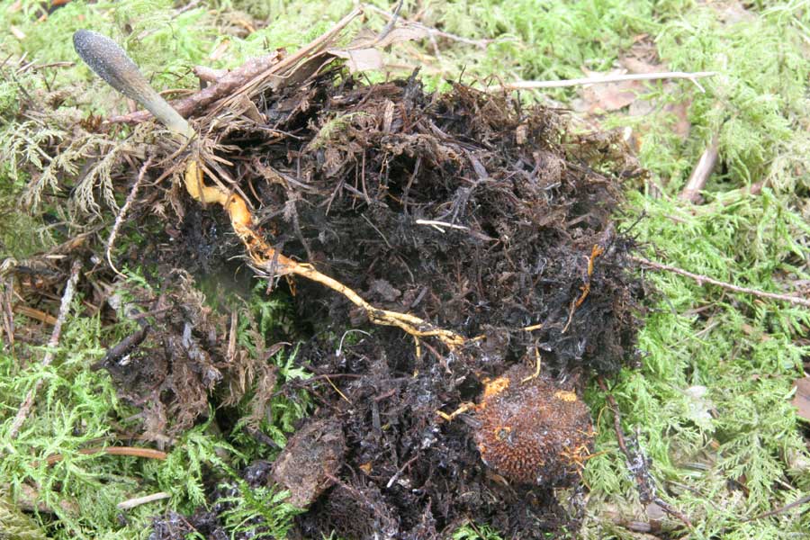 掘り出してみると地下に子実体を形成し一生を土の中で過ごす地下生菌であるツチダンゴ科のキノコに繋がっているのが分かる。