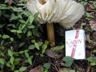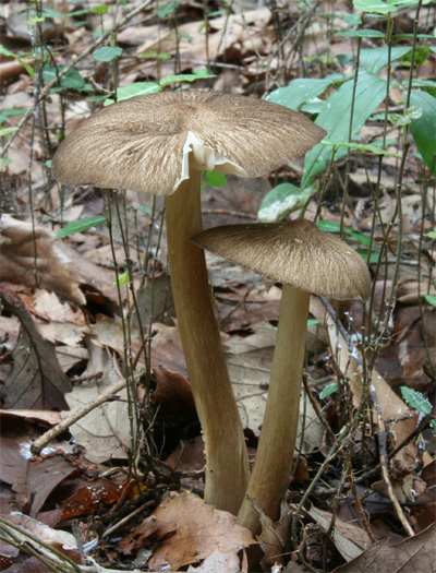 | 時に15センチを超える大型菌となるので、梅雨時の雨を吸い込み過ぎて、倒れている個体をよく見る。広葉樹の根元で春から夏にかけてよく見る、5-6センチの灰色の傘のキノコ。当地ではコノナラの木の根元の発生が多い。毒の可能性あり。 | |