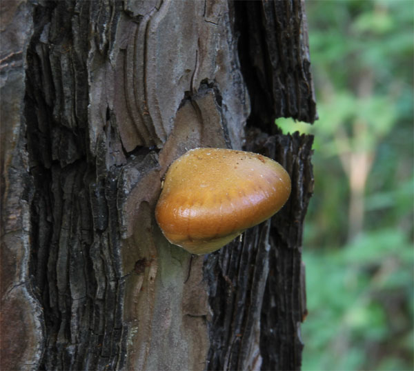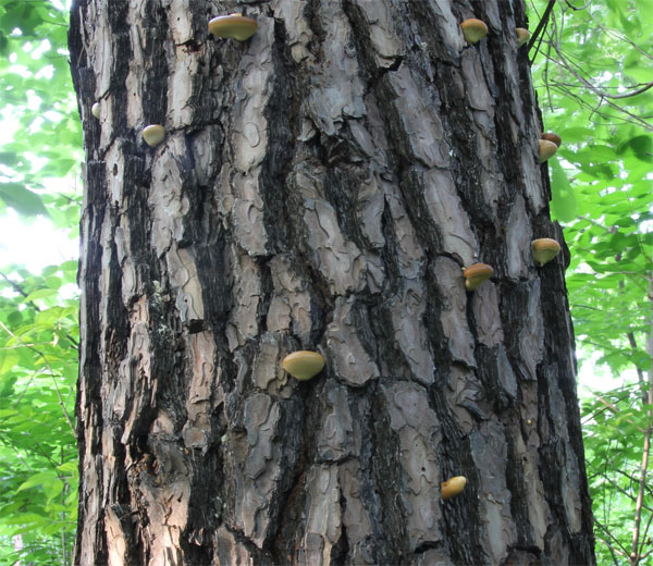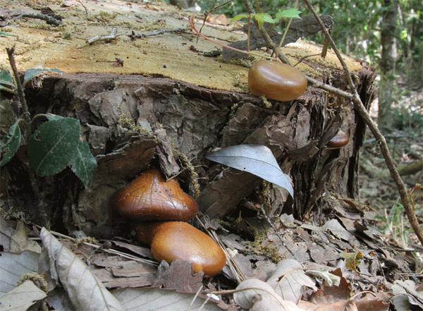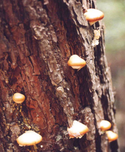 | 枯れた赤松に発生し、独特なパインオイルのような臭いでその発生を知ることができる。 見かけは、チョコレートや栗饅頭みたいである。しかしこのきのこの発生は松枯れの多い狭山丘陵では有難くはない存在だ。 |
