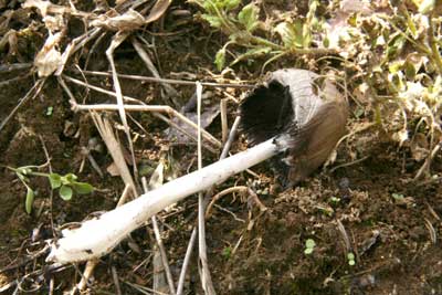 一夜の命のキノコ、 実際にはもう少し生きが長いが、最後には、真っ黒の液体になっていまう。傘の上には土が付着しているが、アスファルトのわずかな隙間からでも発生することがあるそうです。 |
