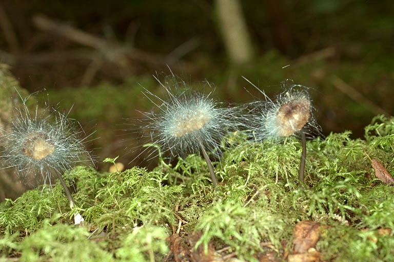 | 新種のキノコ? よく見ると、キノコに生えたカビだと判明。 光にあたってきれいに輝いてしました。 タケハリカビ属の一種と思われます。富士山3号目 |