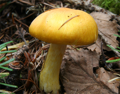 晩秋のカラマツ林のキノコ。 粘性があり小さいので採取が大変なためコンキタケと呼ぶ地方もある。