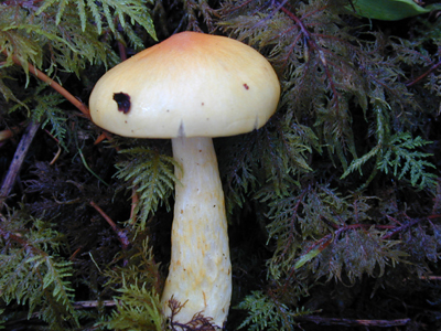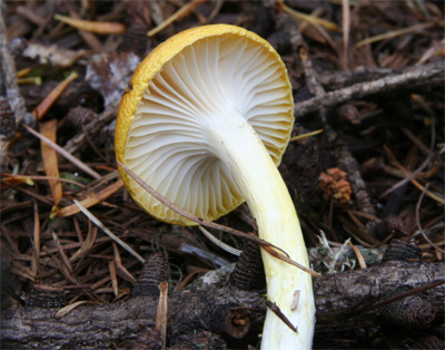 ひだは疎で垂生 柄はやや黄色を帯びる