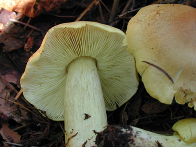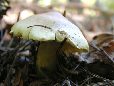 日当たりのよい赤松林で見つけた。シモコシ(まだ見たことが無い)に似ているらしい。ひだはレモン色。ごった煮で食べたので、ほろ苦いらしいが、確認できなかった。