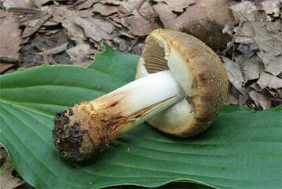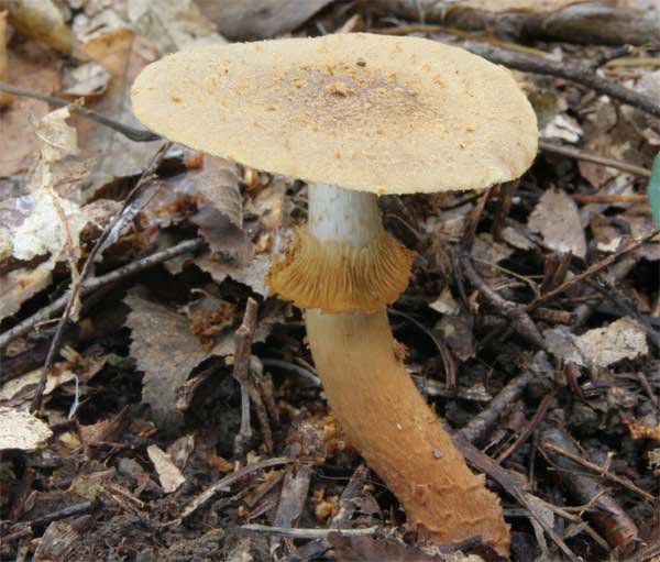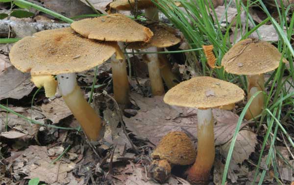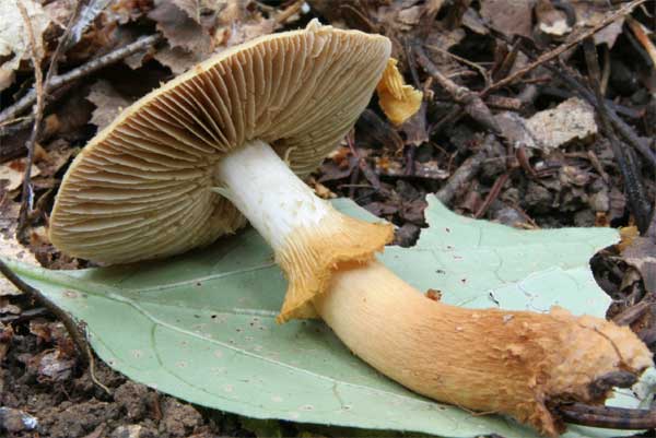 傘には綿屑状の皮膜片が付着する つばは黄色膜質で表面に条線がある