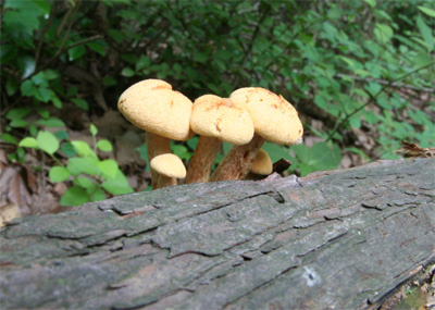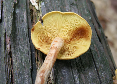 ひだは直生し、傷つけると茶褐色に変色する 傘の縁部は内側に巻く