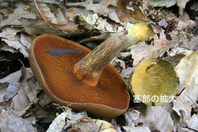 | 孔口はこげ茶色、傷つけると濃い青色変わる。 柄は黄色地に暗褐色の細点 基部は黄色のあらい菌糸 | |