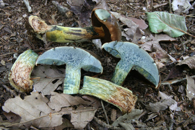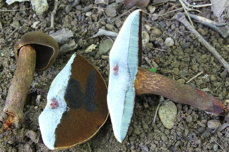 | 肉は全体に白から淡黄色で青変し、柄の基部は赤い。 | |