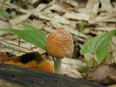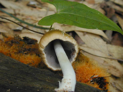 傘には粒状の鱗片をつける、基部の周辺にはオレンジ色のオゾニウム(菌糸マット)がある。