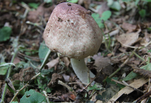 | 傘は径5センチ程 白地に赤紫色の細かい鱗片を付着し中央部では密集 |