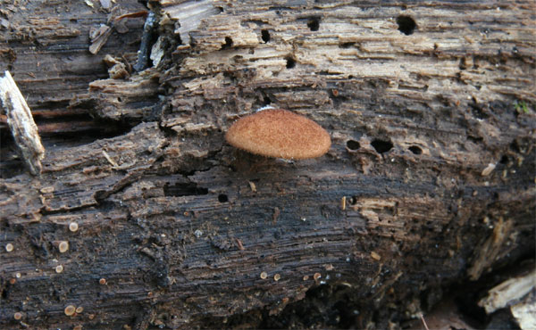 広葉樹の腐朽材に発生 褐色の微毛状