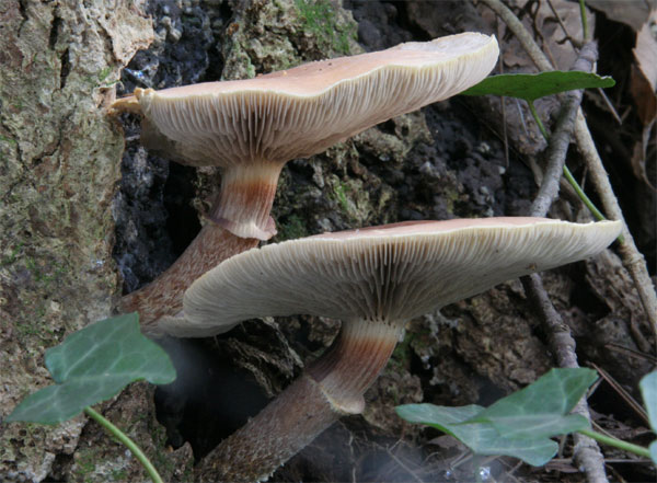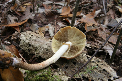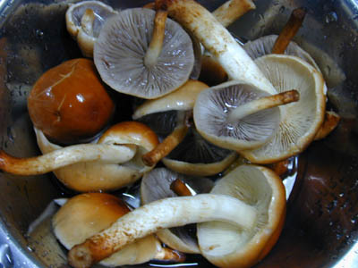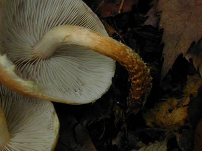 | 上部白色で下部はさび褐色で、繊維状の紋あり。幼菌じ不明瞭。 | 水洗いしてて気が付いたが、水に濡れると、薄い灰色になるものがある。 |